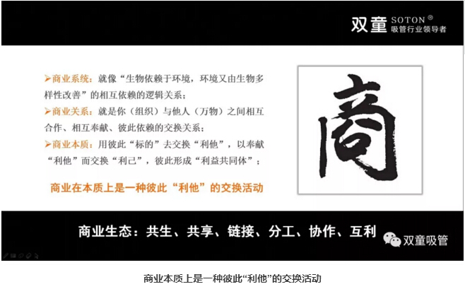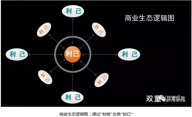 將“商業(yè)的本質(zhì)”與“人性”剖析清楚后,樓總將一幅商業(yè)生態(tài)邏輯圖展現在大家面前,抽絲剝繭地將商業(yè)邏輯完整地講解出來(lái):人與他人(天下萬(wàn)物)之間存在彼此交換的過(guò)程,你對員工的態(tài)度、對社會(huì )的態(tài)度、對環(huán)境的態(tài)度、對資源的態(tài)度、對他人的態(tài)度(包含競爭對手),換取了“他人”對你的態(tài)度,這也是利他的背后一定是利已的商業(yè)本質(zhì)!