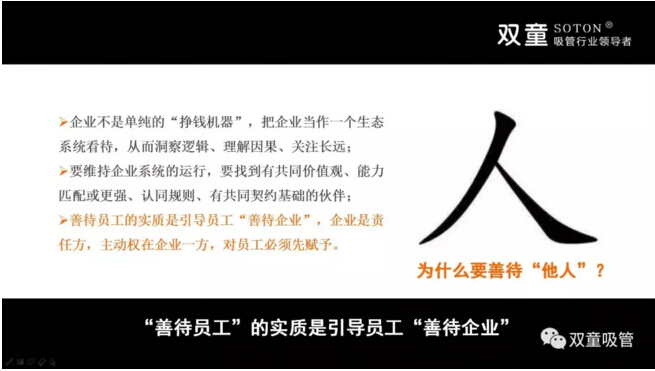 同時(shí),樓總也引導同學(xué)們透過(guò)現象看本質(zhì),“雙童”之所以15年前建設節能降耗系統,消滅所有的污染排放是因為“雙童”看的很遠,用“利他”去獲得“利已”!