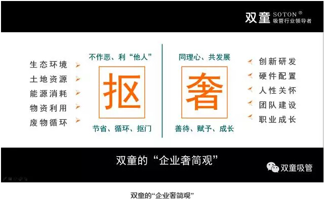 在商業(yè)本質(zhì)的認知下,“雙童”形成了自己獨特的企業(yè)“奢簡(jiǎn)觀(guān)”:公司在建廠(chǎng)之初建設了雨水收集、廢水處理、垃圾回收等節能降耗設施,通過(guò)這樣創(chuàng )新的方式把生產(chǎn)做到了零排放。與此同時(shí),建設花園式工廠(chǎng),提高土地利用率,對能源、物資追求產(chǎn)出最大化,對廢物不斷循環(huán)利用,從而每年“摳”出數百萬(wàn)元,“奢侈”地用在創(chuàng )新研發(fā)、硬件配置以及對員工的人性關(guān)懷、團隊建設上,和團隊一起共發(fā)展!