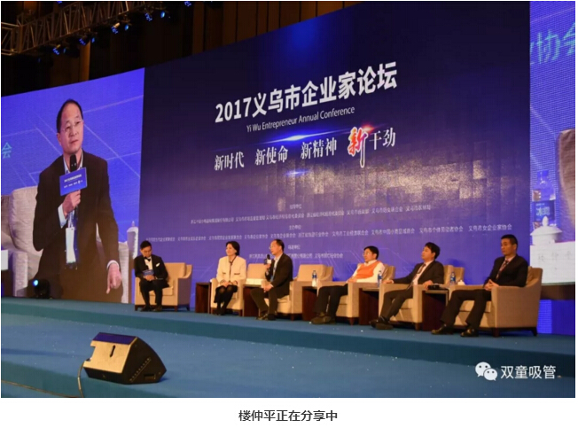 在最受矚目的企業(yè)家分享環(huán)節,“雙童”樓仲平與義烏新光控股集團董事長(cháng)周曉光、義烏浪莎襪業(yè)有限公司董事長(cháng)翁榮金、義烏華鴻控股集團有限公司董事長(cháng)龔品忠、義烏小微企業(yè)代表黃洪鳴這幾位義烏企業(yè)界大咖被邀上臺,共同分享了他們的2017年收獲以及2018年的展望!