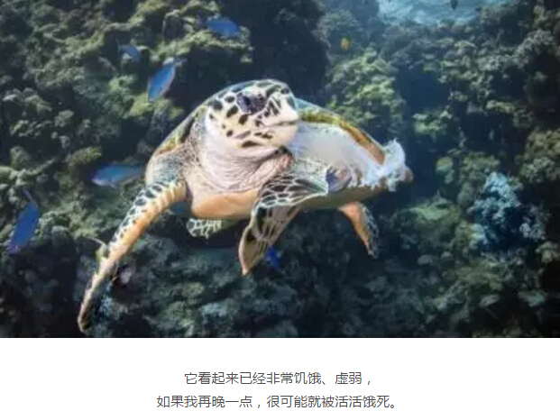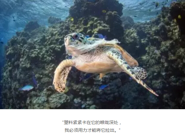 還有一位潛水大叔在海底發(fā)現被塑料卡住喉嚨的海龜。