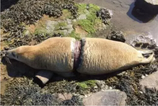 它被塑料打包環(huán)死死套住,自己沒(méi)辦法弄掉,越長(cháng)大就越緊,最終打包環(huán)卡進(jìn)它的肉里。