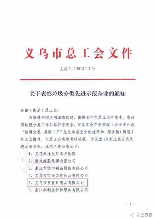 2017年年底,義烏市總工會(huì )開(kāi)展了“垃圾分類(lèi)、美麗工廠(chǎng)”先進(jìn)示范企業(yè)創(chuàng )建活動(dòng)。近日,總工會(huì )通過(guò)考核驗收共評選出20家垃圾分類(lèi)先進(jìn)示范企業(yè),“雙童”就是其中之一。其實(shí),早在2009年,“雙童”就吹響了企業(yè)節能降耗最后一“戰”——“垃圾分類(lèi)”的號角。今天,吸管妞就和大家分享“雙童”在垃圾分類(lèi)方面的經(jīng)驗,一起來(lái)看看吧!