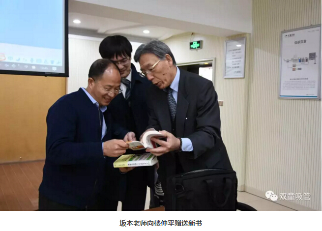 參觀(guān)完畢,大家來(lái)到九樓閣交流分享。首先,坂本老師向樓仲平贈送了他新出的兩本管理書(shū)籍,并代表日本團隊由衷地對“雙童”的熱情貼心接待表達了感謝之情!