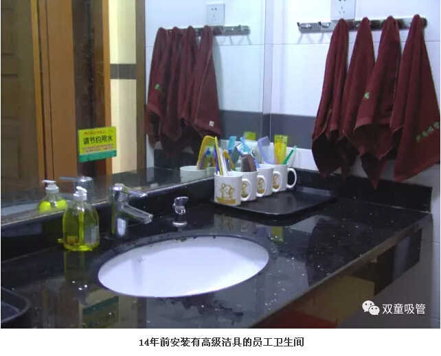 “雙童”很奢,奢在連員工寢室的“水龍頭”都要四五百塊錢(qián)一個(gè)!2004年,“雙童”按三星級標準裝修了所有員工寢室。每個(gè)寢室都配有干凈整潔的洗手間、寬敞明亮的洗衣陽(yáng)臺和格力的空調,并配有各種家具,還提供24小時(shí)的熱水和純凈水飲用系統。連衛生間內配置的科勒牌水龍頭價(jià)格就高達500多元,十多年過(guò)去至今沒(méi)有壞過(guò)一個(gè)。