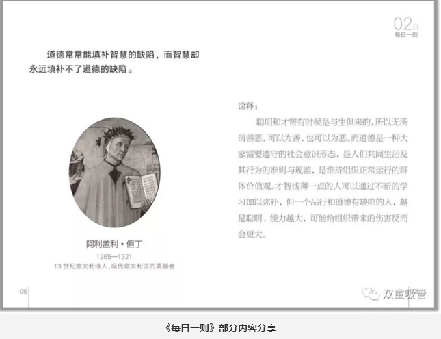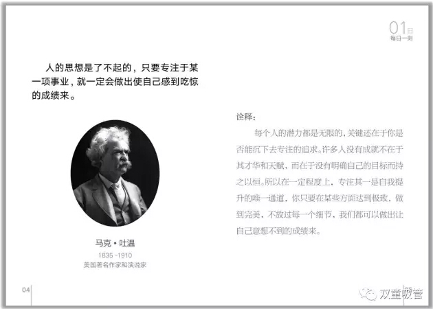 首先,就是晨讀環(huán)節。“雙童”所有員工在上班之前都會(huì )在統一時(shí)間誦讀“雙童”的企業(yè)文化叢書(shū)——《每日一則》。這本《每日一則》里,共收錄了31句名人經(jīng)典語(yǔ)錄,以月度為單位讓員工進(jìn)行重復誦讀,內容包含了專(zhuān)注、創(chuàng )新、共贏(yíng)、正氣等主題。這可是員工們從幾千條好句里挑出來(lái),并且自己解析的呢!