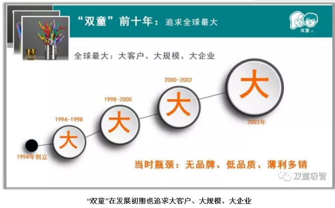 因此,“雙童”在最初的10年,正是沿著(zhù)這樣的思路,以量取勝,不斷擴大規模,以規模換效益,追求大客戶(hù),喜歡大訂單,成為了吸管行業(yè)的巨頭。樓仲平坦言:當時(shí)的大客戶(hù)往往一個(gè)單子就是幾十個(gè)貨柜,接下來(lái)后公司 3-5個(gè)月需要專(zhuān)注做它的單子,無(wú)暇應接別的中小客戶(hù),不用滿(mǎn)世界去找訂單做。