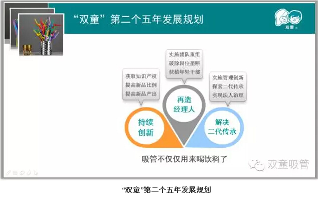 2011年9月,“雙童”又提出了第二個(gè)五年發(fā)展規劃,其中也提出了“持續創(chuàng )新”的關(guān)鍵詞,提高新品產(chǎn)出、提高新品比例、獲取知識產(chǎn)權,進(jìn)一步推動(dòng)企業(yè)的創(chuàng )新工作。