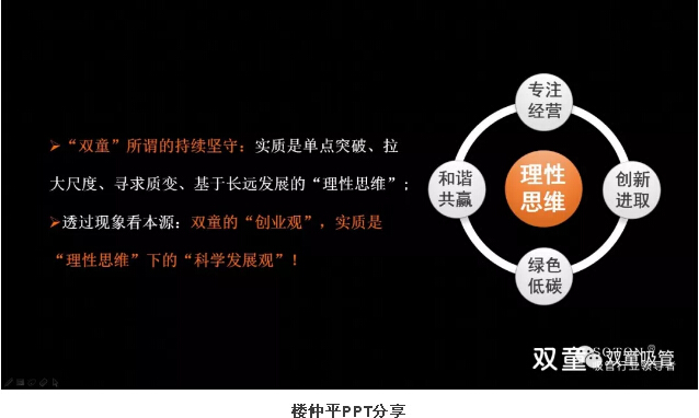最后,樓仲平也對雙童“理性創(chuàng )業(yè)思維”進(jìn)行了總結:它就是基于理性思考,忠于常識依據,源于邏輯推斷,而非意識形態(tài)、信仰、情緒和喜好的“有別于他人”的商業(yè)思維和企業(yè)文化;而這樣的“商業(yè)思維和企業(yè)文化”必然是建立在“利他而利己”的前提之下,從而推動(dòng)企業(yè)形成可持續發(fā)展的“科學(xué)發(fā)展觀(guān)”!