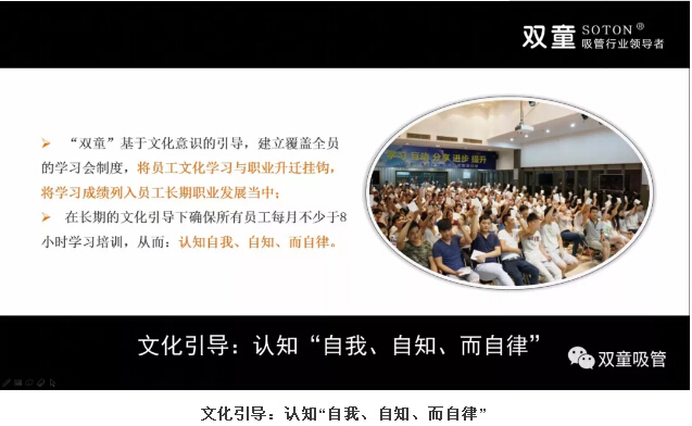 從企業(yè)經(jīng)營(yíng)的角度來(lái)說(shuō),“雙童”就極為重視“文化載體”的維護和調整,建立了以“價(jià)值觀(guān)傳播”、“閃亮點(diǎn)傳播”、“自媒體傳播”的文化傳播體系。如:“雙童”基于文化意識的引導,建立覆蓋全員的學(xué)習會(huì )制度。在長(cháng)期的文化引導下確保所有員工每月不少于8小時(shí)學(xué)習培訓,從而引導員工們認知自我、自知、而達到自律。