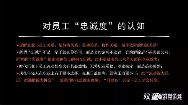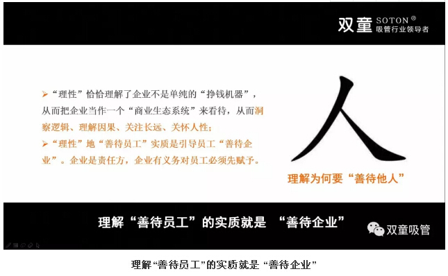 需要注意的是,所謂的“理性經(jīng)營(yíng)”絕非是不講情理,更非冷血動(dòng)物……“理性”關(guān)注的是“人性”所需,“雙童”建立以“人”和“家”為中心的人性化管理模式,“理性”地“善待員工”,實(shí)質(zhì)是引導員工“善待企業(yè)”。