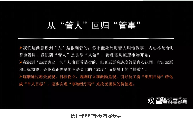 在“理性”思維的持續引導下,“雙童”在文化中倡導把員工看成是平等、完整的“人”,而非站在道德高地上居高臨下。在“雙童”的文化呈現、氛圍營(yíng)造和溝通方式上,處處體現了“理性”思維,通過(guò)愿景展現、目標設立、規則訂立和激勵兌現,引導員工將“組織目標”轉化成“個(gè)人目標”,逐步實(shí)現“事物性引導”來(lái)改變團隊的價(jià)值觀(guān)。所以,管理不是管控、教條和賦予,而是激發(fā)和釋放每個(gè)人的善意,幫助員工成長(cháng)、激發(fā)其創(chuàng )造,在共同追求中形成一致的價(jià)值和理念認同。