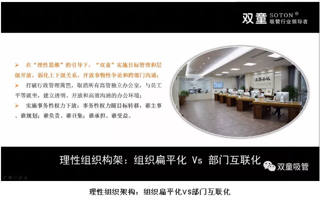 在“理性思維”的持續引導下,“雙童”實(shí)施目標管理和層級開(kāi)放,弱化上下級關(guān)系,開(kāi)放事務(wù)性爭論和跨部門(mén)溝通;打破行政管理籬笆,取消所有高管獨立辦公室,與員工平等就坐,建立透明、開(kāi)放和高效溝通的辦公環(huán)境;實(shí)施事務(wù)性權力隨目標轉移,誰(shuí)主事、誰(shuí)規劃;誰(shuí)負責、誰(shuí)召集;誰(shuí)承擔、誰(shuí)受益。
