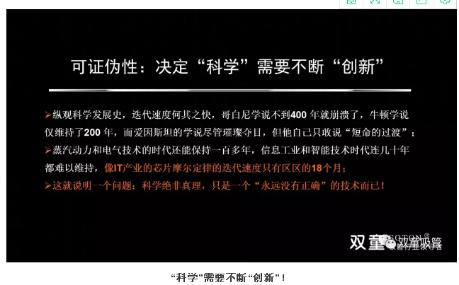 關(guān)于到底什么是“科學(xué)”?著(zhù)名經(jīng)濟學(xué)家波普爾提出了“證偽主義科學(xué)論”對“科學(xué)”進(jìn)行了界定:凡是能夠證明是錯了的學(xué)問(wèn)才能叫“科學(xué)”,并用極厚的一本書(shū)作了系統證明,這跟我們平常的理解正好相反。這就說(shuō)明一個(gè)問(wèn)題:科學(xué)絕非真理,只是一個(gè)“永遠沒(méi)有正確”的技術(shù)而已!“科學(xué)”需要不斷“創(chuàng )新”!