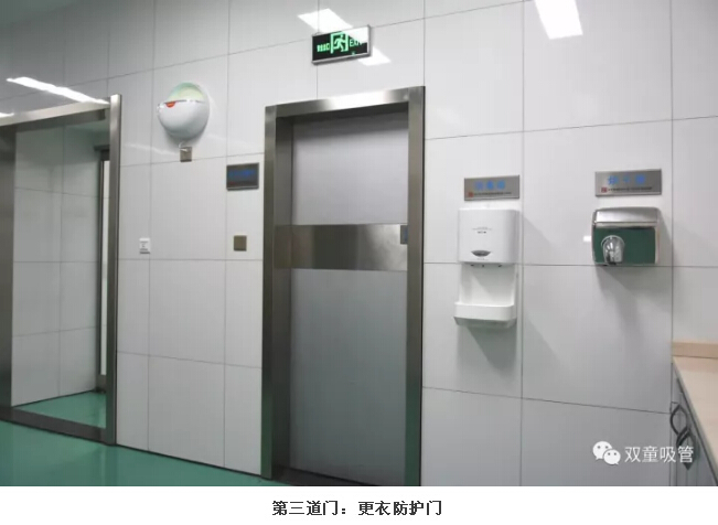 3.經(jīng)過(guò)了兩道防護門(mén)后,員工們更衣后通過(guò)更衣防護門(mén)進(jìn)入洗手消毒區域。