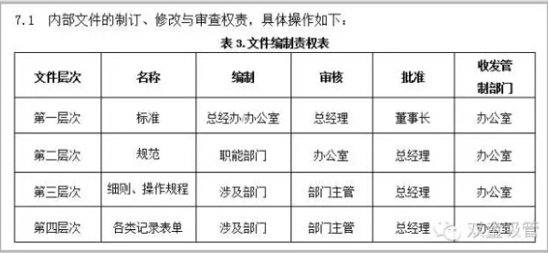第二層次文件:本公司內部的職能部門(mén)之間對某一活動(dòng)的聯(lián)系方式的描述,有關(guān)經(jīng)營(yíng)管理活動(dòng)步驟的規范;