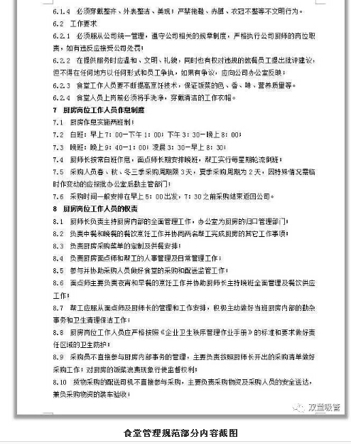 對此,公司組織人員編寫(xiě)了餐飲管理細則,涉及到餐飲管理的各個(gè)方面,從餐飲管理成本、廚師上崗要求、廚房崗位工作權責、餐費管理原則、食堂衛生保障、員工滿(mǎn)意度調查等方面進(jìn)行一一細化,每項內容都有具體的實(shí)施條例!