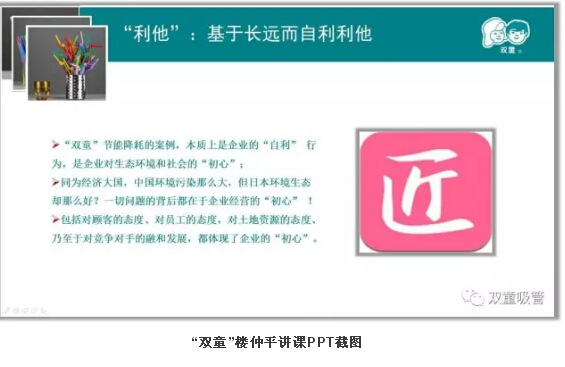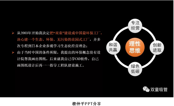 很多來(lái)“雙童”參觀(guān)的客人們,都會(huì )驚嘆于我們這座零排放無(wú)污染的生態(tài)節能工廠(chǎng),并不斷追問(wèn):“到底是哪家建筑設計公司給你們設計的廠(chǎng)房?”每當此時(shí),吸管妞都會(huì )自豪地回答:“其實(shí)都是我們當家人樓總自己設計的廠(chǎng)房!”那么,早在十多年前,整個(gè)社會(huì )環(huán)境都沒(méi)有倡導節能環(huán)保理念的當時(shí),“雙童”樓仲平為何會(huì )選擇帶領(lǐng)企業(yè)走這條發(fā)展道路呢?這背后也有一個(gè)精彩的故事。下面,吸管妞就借“雙童”樓仲平在浙江大學(xué)授課時(shí)的一段視頻,揭秘其中的奧秘!