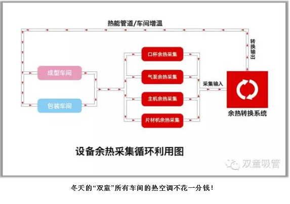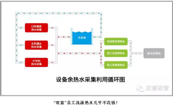 設備余熱水采集和設備余熱采集循環(huán)系統:“雙童”對所有經(jīng)過(guò)模具的50度溫水進(jìn)行收集,處理之后供應到所有寢室衛生間給員工洗澡洗衣生活之用。同時(shí),“雙童”也引進(jìn)日本技術(shù)對所有生產(chǎn)設備的余熱和廢氣進(jìn)行采集并回收,再通過(guò)空調管道輸送到需要加溫的各個(gè)車(chē)間和工段。通過(guò)上述方式,“雙童”光是在余熱水采集和設備余熱采集方面,每年就節省了150多萬(wàn)元,消滅了企業(yè)產(chǎn)生的污染和排放!