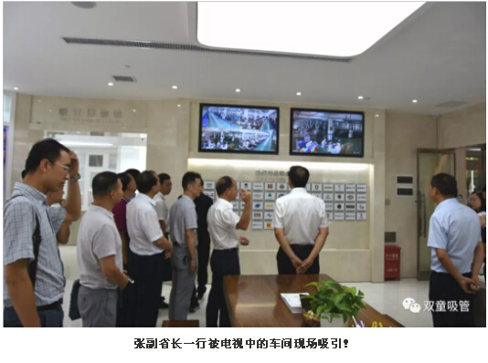 來(lái)到“雙童”吸管產(chǎn)品陳列廳時(shí),張副省長(cháng)一行被墻面上的兩臺大屏三星液晶電視吸引。原來(lái),這兩臺電視機上連接著(zhù)車(chē)間的監控端,讓客戶(hù)在不進(jìn)入車(chē)間的前提下也能了解到“雙童”的車(chē)間生產(chǎn)狀況!對于這樣的“神”操作,張副省長(cháng)也給了個(gè)大大的贊!