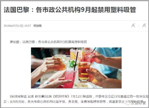 法國《歐洲時(shí)報》報道稱(chēng),巴黎市議會(huì )投票通過(guò)的一項決議規定:從9月開(kāi)始,各大市政公共機構比如學(xué)校、養老院、體育場(chǎng)和博物館等,將逐漸禁止使用塑料吸管。