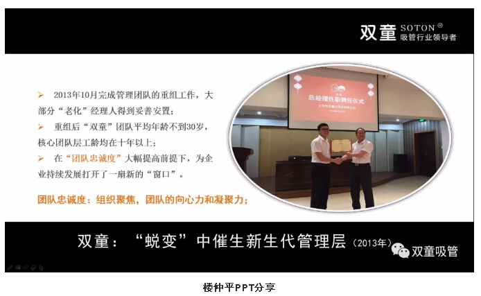 現在,公司有二三十個(gè)中高層,平均工齡10年以上,年齡30歲左右,都是我一個(gè)個(gè)帶出來(lái)的,“雙童”做的吸管是一個(gè)比較偏門(mén)的行業(yè),沒(méi)有行業(yè)的通用性人才,所以我們基本不用空降兵。這批人是我帶出來(lái)的,就深受我的影響,在乎工作、可以放下身段,整體素質(zhì)遠超第一代管理者。這批第二代管理者培養起來(lái)后,至少打開(kāi)了“雙童”未來(lái)二十多年企業(yè)持續發(fā)展的窗口。