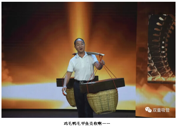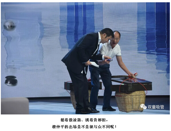 相比于其他兩位嘉賓,“雙童”樓仲平的出場(chǎng)方式可算是最“與眾不同”啦!看,當主持人“鷗哥”邀請樓仲平出場(chǎng)時(shí),他竟然搖著(zhù)撥浪鼓、挑著(zhù)貨郎擔,口里還喊著(zhù)“雞毛鴨毛甲魚(yú)殼收啊……”就上場(chǎng)了!