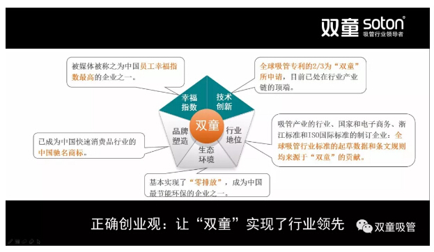 介紹完自己,吸管妞也通過(guò)一系列圖片,從企業(yè)創(chuàng )新、行業(yè)地位、生態(tài)環(huán)境、品牌塑造和人文關(guān)懷方面介紹了“雙童”,使在座聽(tīng)眾對企業(yè)有了大致上的認知和了解。