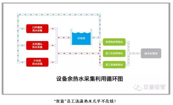 “雙童”對所有經(jīng)過(guò)模具的50度溫水進(jìn)行收集,處理之后供應到所有寢室衛生間給員工洗澡洗衣生活之用。同時(shí),“雙童”對所有生產(chǎn)設備的余熱和廢氣進(jìn)行采集并回收,再通過(guò)空調管道輸送到需要加溫的各個(gè)車(chē)間和工段。通過(guò)上述方式,“雙童”光是在余熱水采集和設備余熱采集方面,每年就節省了150多萬(wàn)元,消滅了企業(yè)產(chǎn)生的污染和排放!