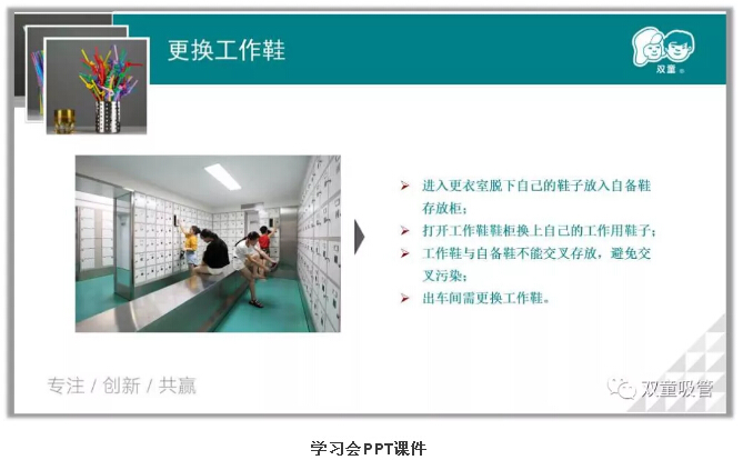 聽(tīng)到這里,很多新員工也理解了吸管衛生保障的重要性。接下來(lái),就讓我們跟著(zhù)毛講師的課程,再次重溫一下出入車(chē)間的防護措施吧: