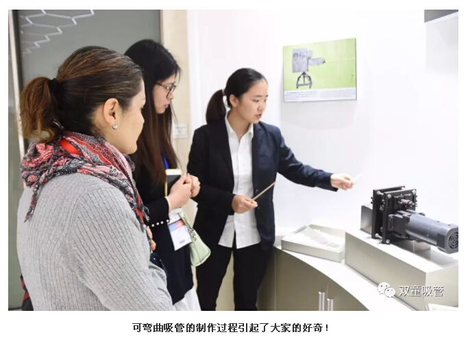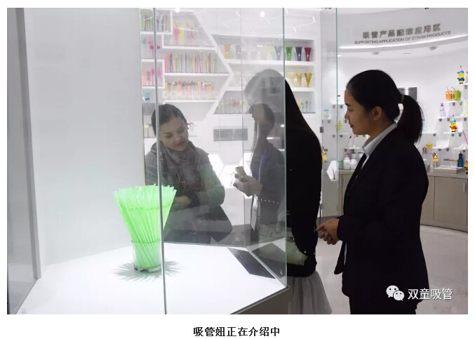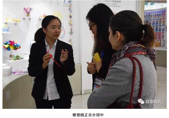 接著(zhù),卡林納女士被“雙童”創(chuàng )新產(chǎn)品體驗區的產(chǎn)品吸引住了,在聽(tīng)了吸管妞對卡通吸管、小鳥(niǎo)吸管、眼鏡吸管、愛(ài)心吸管、哈哈吸管的一番介紹后,她也是覺(jué)得十分的不可思議,一根吸管竟能玩出這么多的花樣!