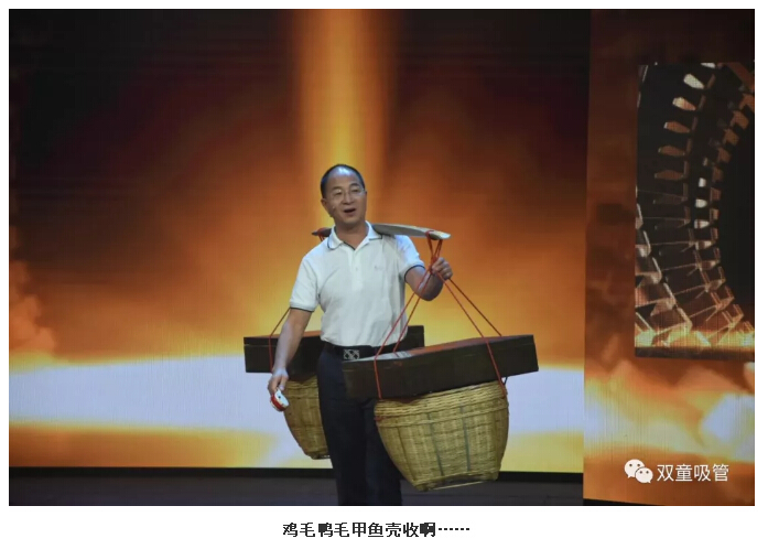 相比于其他兩位嘉賓,“雙童”樓仲平的出場(chǎng)方式可算是最“與眾不同”啦!看,當主持人“鷗哥”邀請樓仲平出場(chǎng)時(shí),他竟然搖著(zhù)撥浪鼓、挑著(zhù)貨郎擔,口里還喊著(zhù)“雞毛鴨毛甲魚(yú)殼收啊……”就上場(chǎng)了!