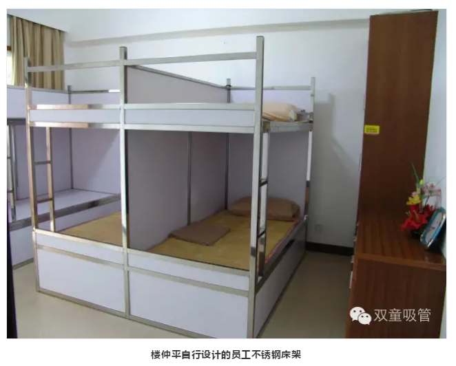 “雙童”員工集體寢室的不銹鋼床架可是參觀(guān)團隊最津津樂(lè )道的話(huà)題之一!這些床架都是由“雙童”樓仲平自行設計,在建造之初就把床架焊在地上。這樣一來(lái),即避免產(chǎn)生垃圾死角,床下又多了一個(gè)封閉的儲物空間,確保員工在生活方面的便利舒適!