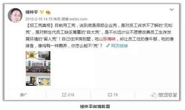 其實(shí),“雙童”樓仲平由于早年坎坷辛苦的創(chuàng )業(yè)經(jīng)歷,一直對農民工感同身受,十分注重員工的吃住問(wèn)題。早在2012年,樓仲平就發(fā)布了一條關(guān)于員工住宿的微博,引起了極大的關(guān)注。微博上寫(xiě)道:自己住洋房別墅,卻讓員工住的像牛棚狗窩,你怎么能留得住員工?員工是企業(yè)的基礎,對員工更好、企業(yè)反而會(huì )獲得更多!