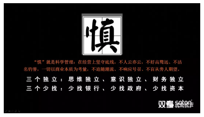 “慎”也是科學(xué)管理的本真,我們要有自己獨立的意識,要有自己獨立的思維,在經(jīng)營(yíng)上要有自己的獨立判斷,堅守底線(xiàn),不人云亦云,一切以商業(yè)本質(zhì)為考量,不追隨潮流、不響應號召、不盲從旁人期望?;谝陨?,我總結出“三個(gè)獨立”和“三個(gè)少找”: