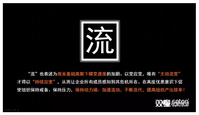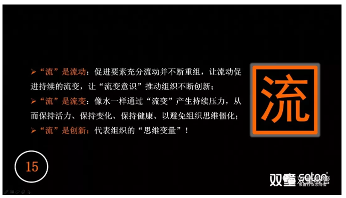 “流”在更深層次上也可以理解為創(chuàng )新,它代表組織的“思維變量”。它是在商業(yè)基礎流變下迭代速度的加速,我們要以變應變,用“主動(dòng)流變”去維持“持續應變”,從而讓企業(yè)所有成員感知到其危機所在。在高度憂(yōu)患意識下,“流”促使了組織保持戒備、保持壓力,加速流動(dòng),不斷迭代,從而提高組織的產(chǎn)出效率!
