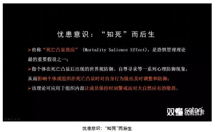 舉個(gè)例子。人類(lèi)是所有動(dòng)物當中唯一知道自己要死的動(dòng)物,從而對自己的死有所準備、有所意識、有所恐懼,有所戒備,從而更早地讓我們有干預,讓我們去迎合和改變。這樣一種“死亡凸顯效應”就叫“知死而后生”。