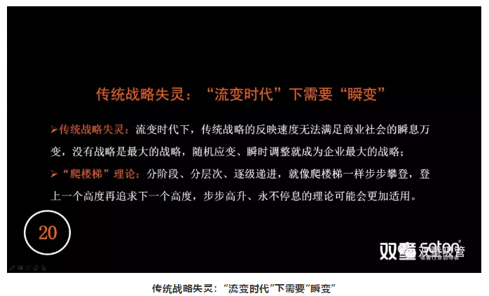 另一個(gè)觀(guān)點(diǎn),我認為在一個(gè)流變的時(shí)代下,由于信息的高速迭代,傳統戰略已經(jīng)失靈。意思就是在流變時(shí)代下,傳統戰略的反映速度無(wú)法滿(mǎn)足商業(yè)社會(huì )的瞬息萬(wàn)變。所以,沒(méi)有戰略有可能是企業(yè)最好的戰略。