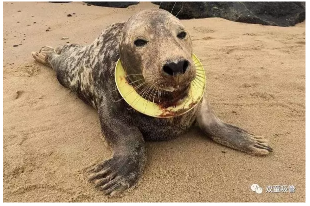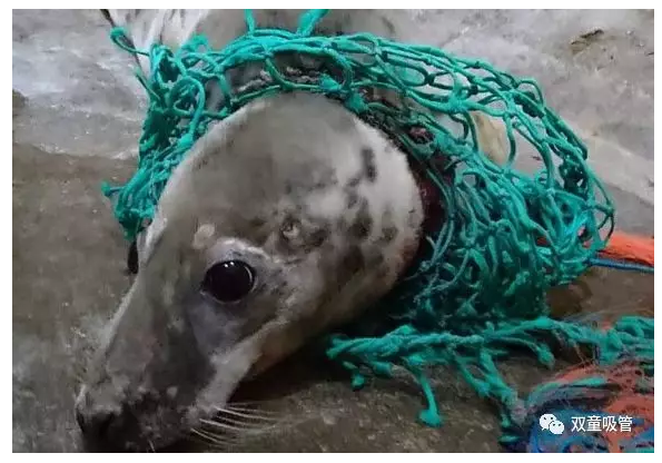 被人造塑料漁網(wǎng)困住的野生海豹!