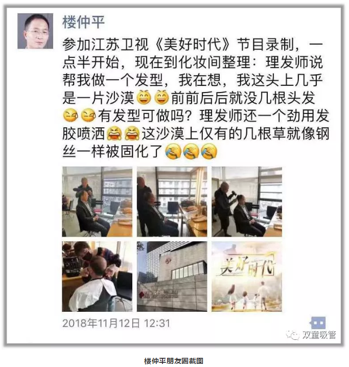 在節目錄制前,“雙童”樓仲平正在整理發(fā)型妝容,理發(fā)師說(shuō)幫樓大大做個(gè)發(fā)型,吸管妞在一邊吐槽:樓總這發(fā)型有啥好整理的?圖中的“光頭”發(fā)型師回嘴:那還是要的,樓總頭發(fā)比我多!樓總也樂(lè )了:“我這頭上幾乎是一片‘沙漠’,還是你頭發(fā)多!”