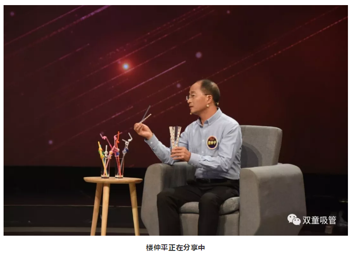 在“雙童”樓仲平上場(chǎng)后,主持人趙丹軍就被桌子上的各類(lèi)吸管所吸引啦!樓仲平也向在場(chǎng)觀(guān)眾介紹了美觀(guān)環(huán)保的可降解吸管和極具特色的創(chuàng )新吸管。