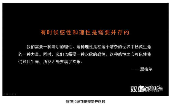 通過(guò)中西方文化的對比,我們可以發(fā)現:我們不能只有“感性思維”,但也不能一味的倡導西方的“理性思維”。唯有“以中為體、以西為用”,將感性思維和理性思維相融合,才能更好地平衡工作和生活!最后,樓仲平也巧妙的用黑格爾的名言分享了感性和理性是需要并存的。