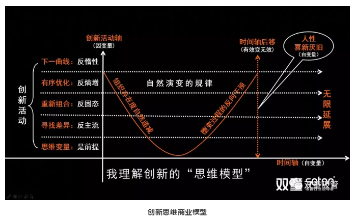 在“創(chuàng )新思維商業(yè)模型”中,X軸是時(shí)間軸,屬于自變量。Y軸是創(chuàng )新深度軸,屬于因變量。創(chuàng )新是對大自然宇宙演化中一種自然規律的干預,而這種自然規律的本質(zhì)是組織存在“自然遞減”的墮變過(guò)程,要想改變自然規律,就必然進(jìn)行不斷地調整和干預,從而讓組織從“下墮”走向“上揚”,否則將會(huì )一直處于遞減的狀態(tài)……