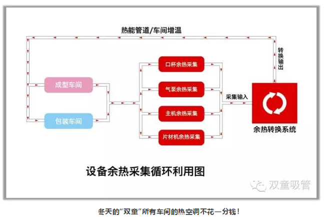 考慮到“雙童”生產(chǎn)設備產(chǎn)生大量余熱的狀況,我們在所有的設備上安裝了余熱采集裝置,把所有生產(chǎn)設備的余熱和廢氣進(jìn)行采集并回收,采集的余熱經(jīng)過(guò)凈化處理后再通過(guò)管道供應給所有車(chē)間進(jìn)行二次能源的利用(原來(lái)需要的熱空調現在不用了,節能了大量的電費)!