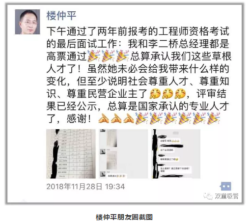 在政策的引領(lǐng)下,在樓仲平不斷突破,不斷精進(jìn)下,樓仲平順利通過(guò)了工程師評審。他也欣喜表示:“雖然這未必會(huì )給我帶來(lái)什么樣的變化,但至少說(shuō)明社會(huì )尊重人才、尊重知識、尊重民營(yíng)企業(yè)主了,總算是國家承認的專(zhuān)業(yè)人才了!”