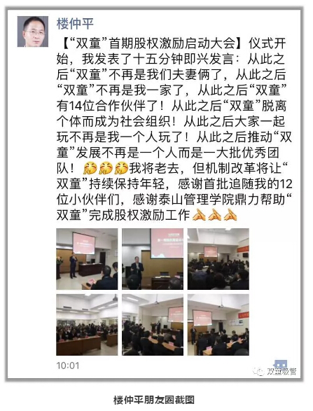 “我終將老去,但機制改革將讓‘雙童’持續保持年輕,感謝所有的員工,感謝首批追隨我的12位小伙伴們,感謝泰山管理學(xué)院鼎力幫助‘雙童’完成股權激勵工作!”