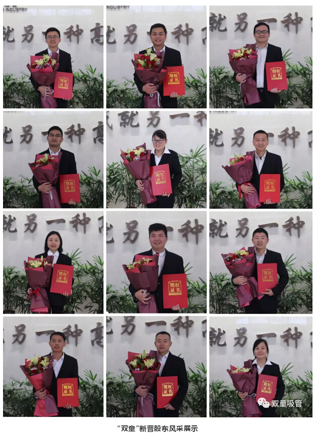 “今天,我從樓總手上接過(guò)股權激勵的證書(shū),我的內心更加激動(dòng)和深刻,我的角色轉變?yōu)楣竞匣锶?。但這也只是一個(gè)開(kāi)始,未來(lái),我們或許會(huì )經(jīng)歷很多的困難,但我始終相信我們可以完成5年后的目標。讓我們在一起少一些抱怨,多一些團結,多一些付出,為‘雙童’更好的明天努力奮斗!”