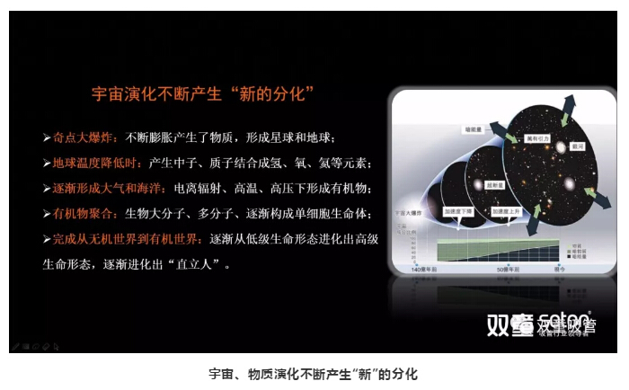 接下來(lái),樓仲平通過(guò)宇宙演化的例子讓大家對創(chuàng )新有更深的理解:宇宙起源于奇點(diǎn)大爆炸,通過(guò)宇宙的演化不斷產(chǎn)生新的物質(zhì),繼而形成星球和地球,產(chǎn)生有機物及生命,形成不斷“新”的分化。
