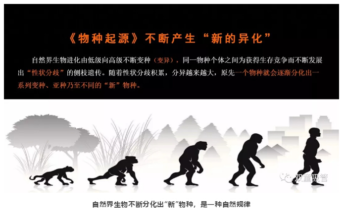隨后,樓仲平也同樣用達爾文的《物種起源》作為案例,在物種演化的過(guò)程中,不斷產(chǎn)生測枝遺傳,隨著(zhù)性狀分歧積累,分異越來(lái)越大,從而不斷產(chǎn)生“新”的物種!