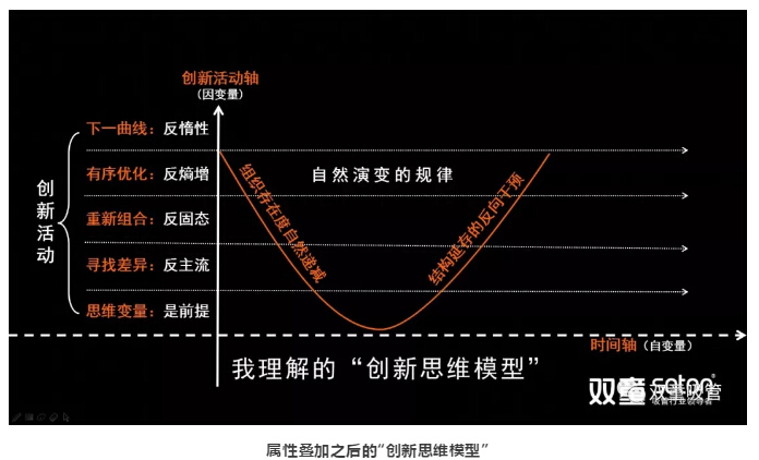 在這個(gè)模型里面,創(chuàng )新活動(dòng)作為創(chuàng )新思維模型的疊加屬性,越往上走,說(shuō)明企業(yè)的創(chuàng )新深度越深……